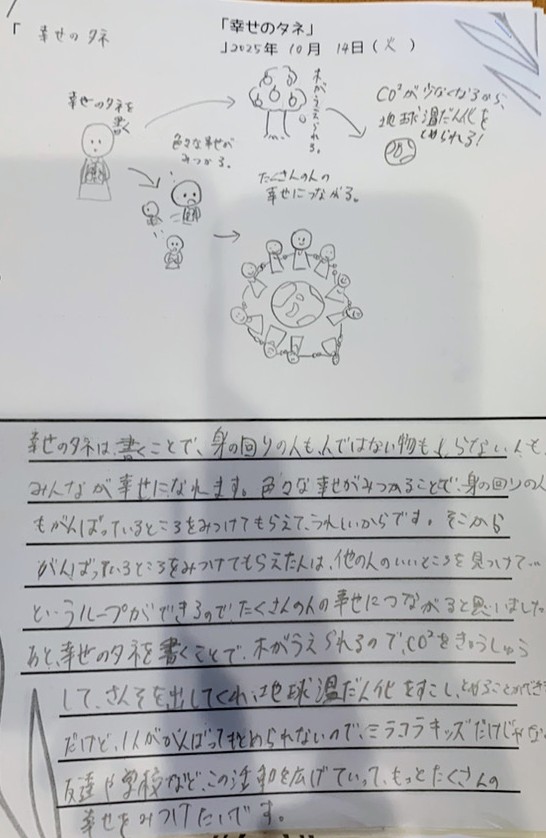 “幸せのタネ”は、自分のことだけでなく、まわりや地球まで広げて考えていけることに気づかせてもらえる幸せのタネです。ミラコラの原点そのものだね。そして、ミラコラキッズだけが幸せのタネを書くのではなく、他の子どもたちもできるようになったら、もっとステキだね。そのアイデアを思いついたら、パブリック・イノベーション賞確定です!
