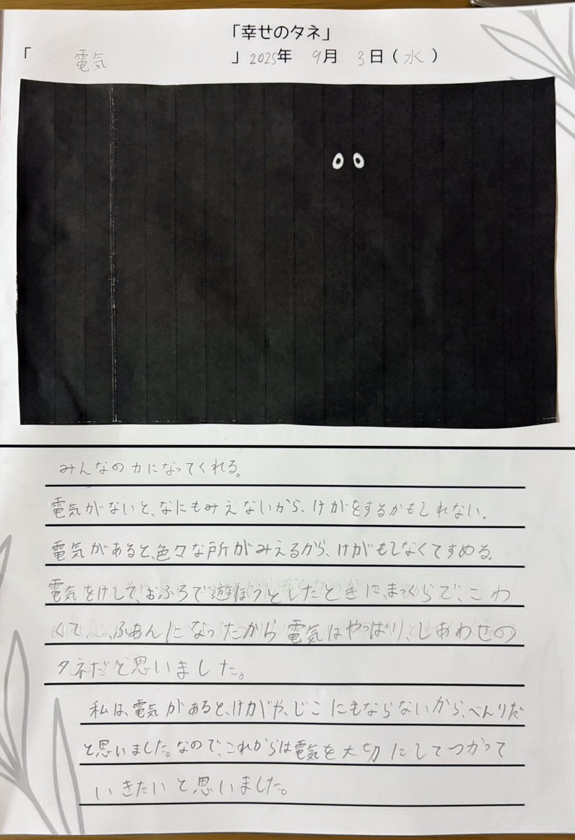 見えないけれど、みんなを支えてくれる電気に気づいた幸せのタネです。