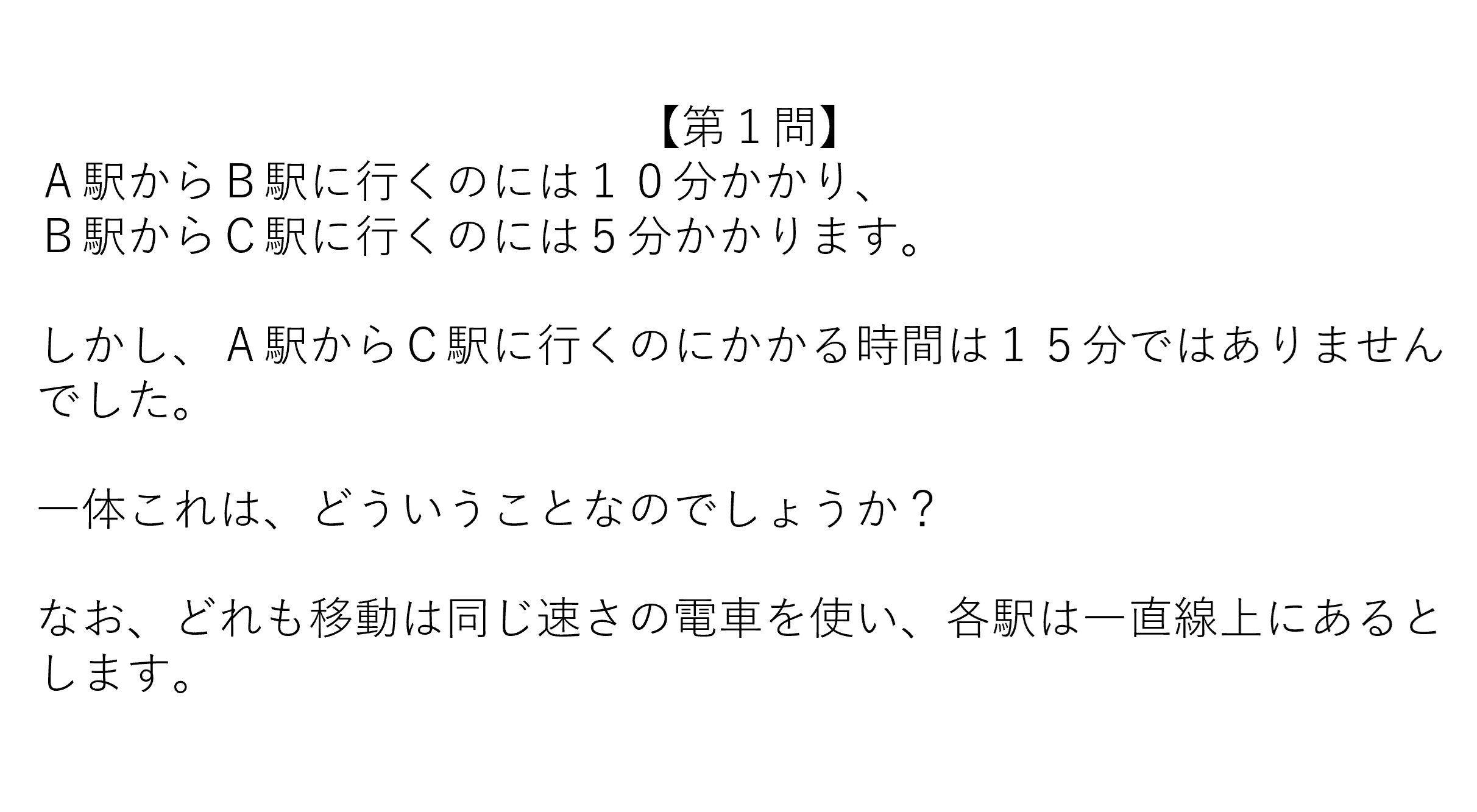 「B駅には電車が止まらないからA駅→C駅は15分よりちょっと速いんじゃない?」