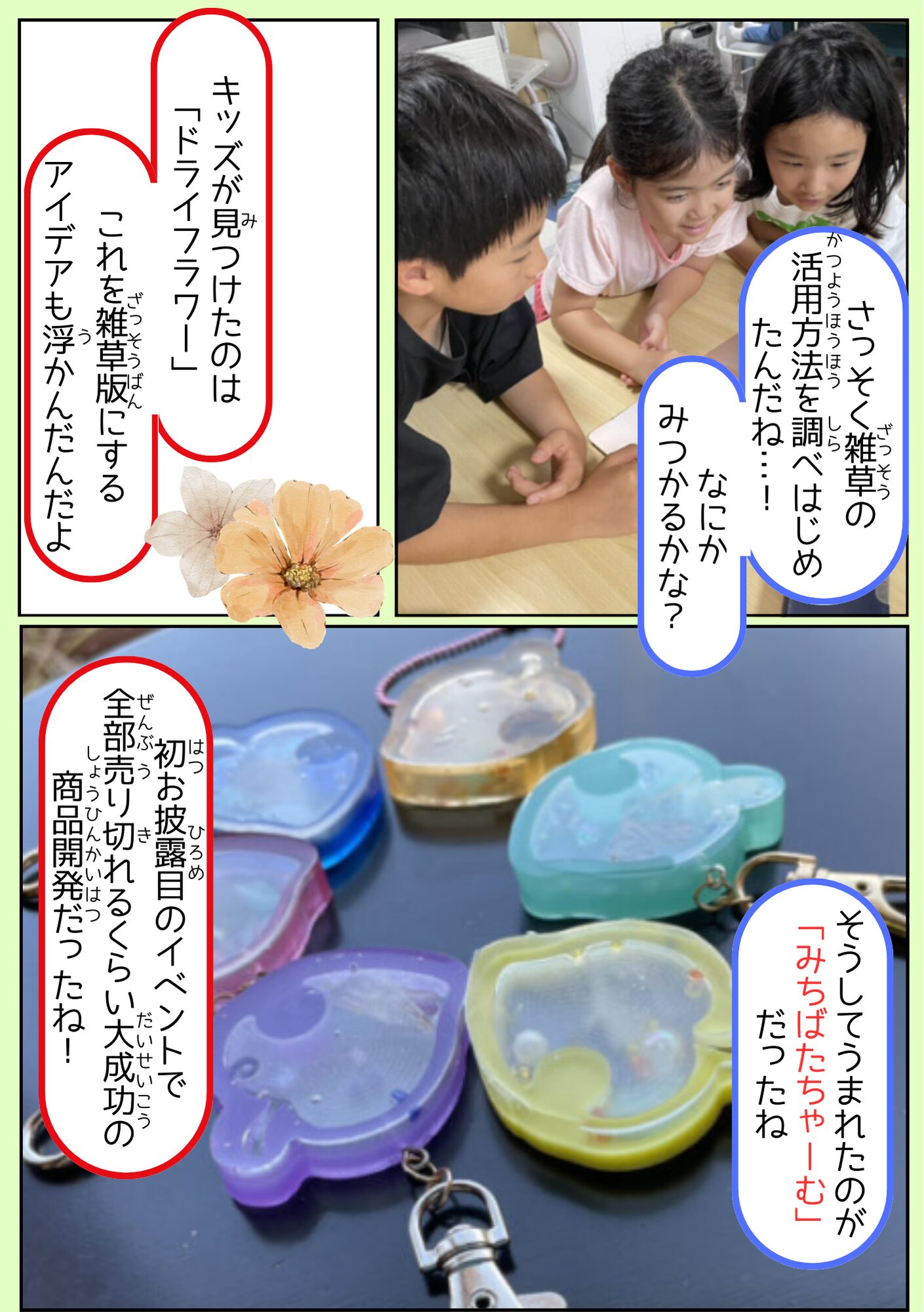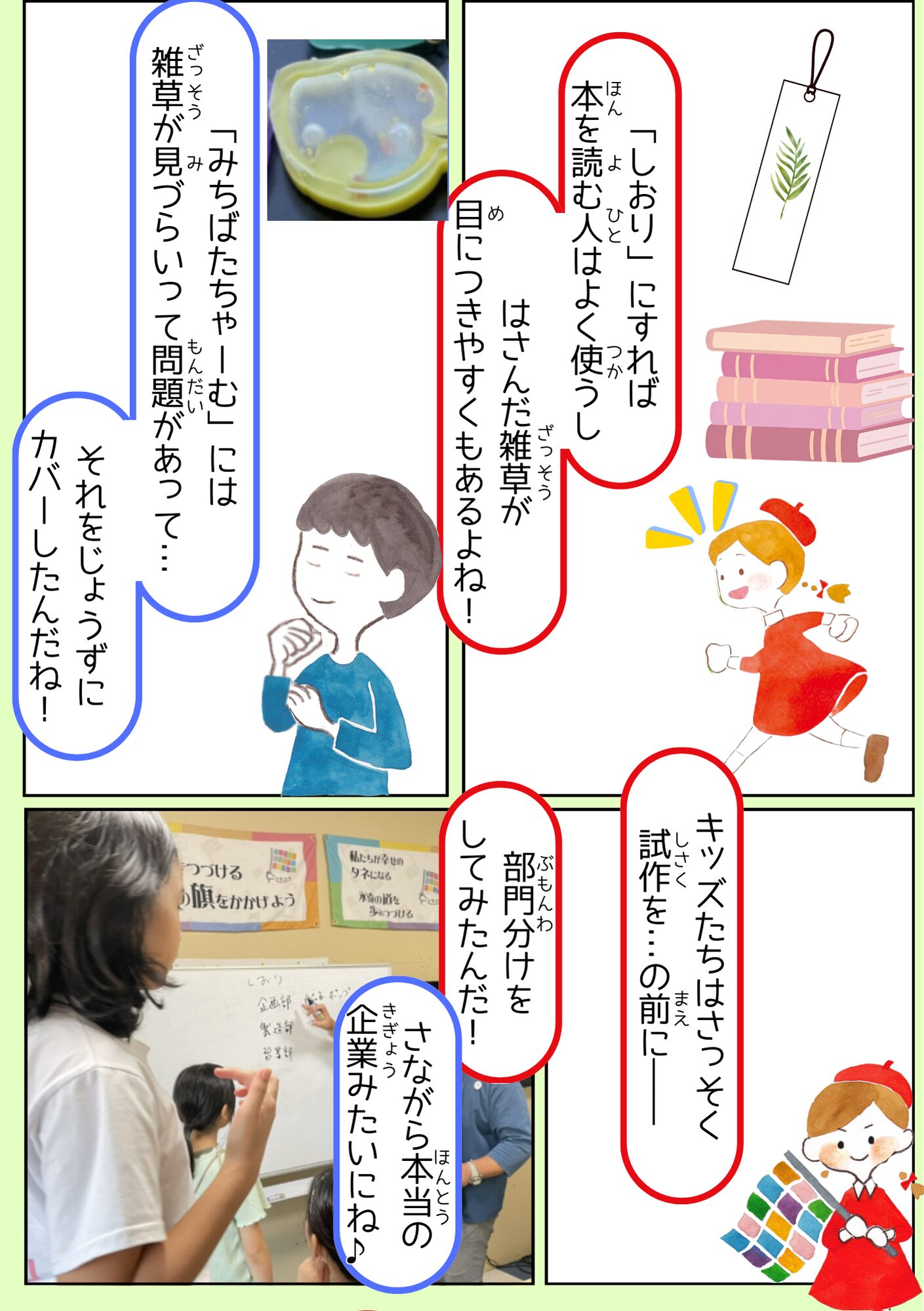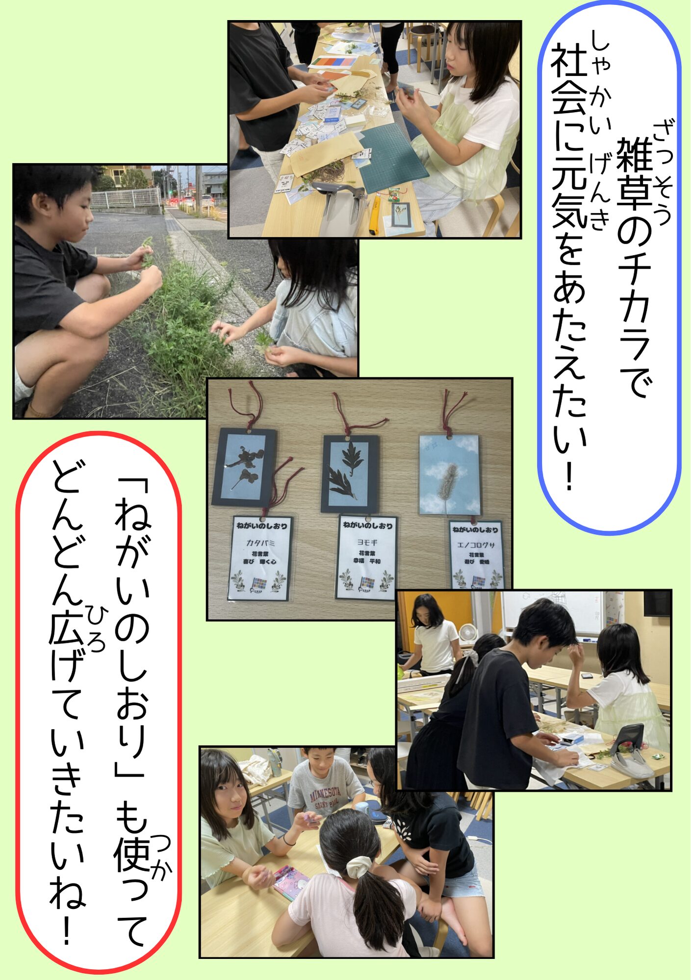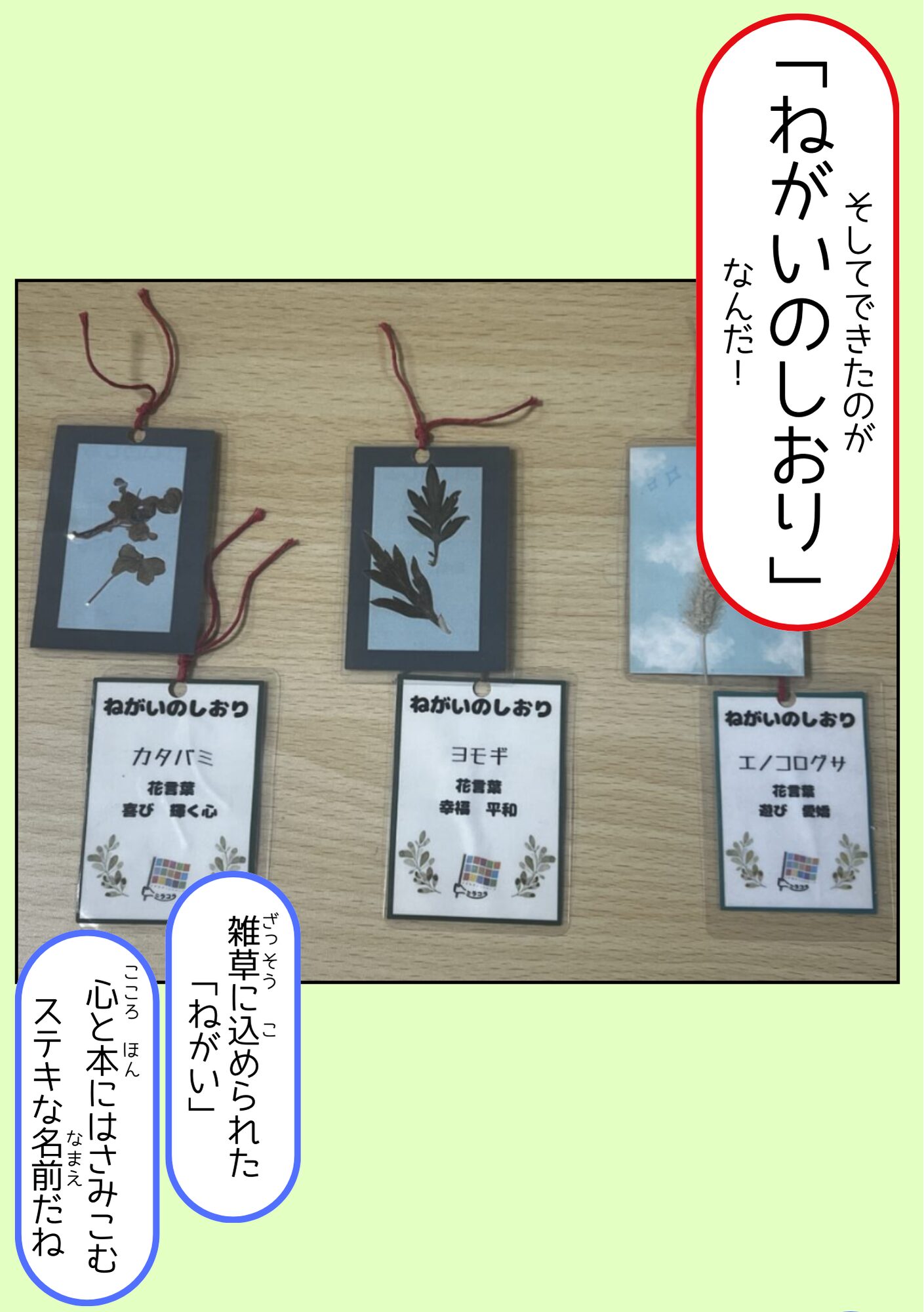 全国のミラコラ ミラコラ名古屋(長久手) ミラコラ大阪 ミラコラ天王寺 ミラコラ梅田天六 ミラコラ泉南 ミラコラ泉佐野 ミラコラ枚方 ミラコラ神戸 いのちの大切さを育む保育園 プロジェクト 2026319 【里山♡こども保育園】 自然を生かした商品開発 ~「ねがいのしおり」で雑草の力をはさみこむ!~